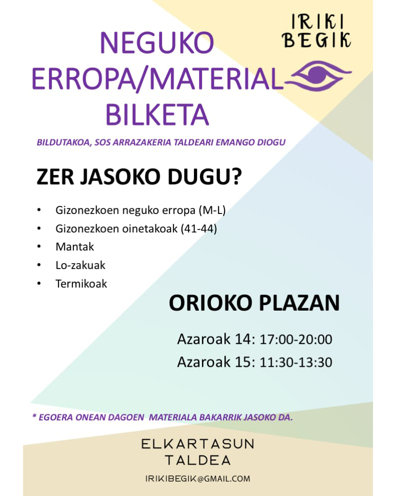 Nagusiki, gizonezkoentzako arropa eta oinetakoak jaso nahi dituzte, baita mantak, lo-zakuak eta material termikoa ere. Azaroaren 14an eta 15ean Herriko Plazan jarriko dute bilketa egiteko postua, ordutegi honetan: azaroaren 14an, ostiralarekin, 17:00-20:00 artean, eta azaroaren 15ean, larunbatarekin, 11:30-13:30 artean.