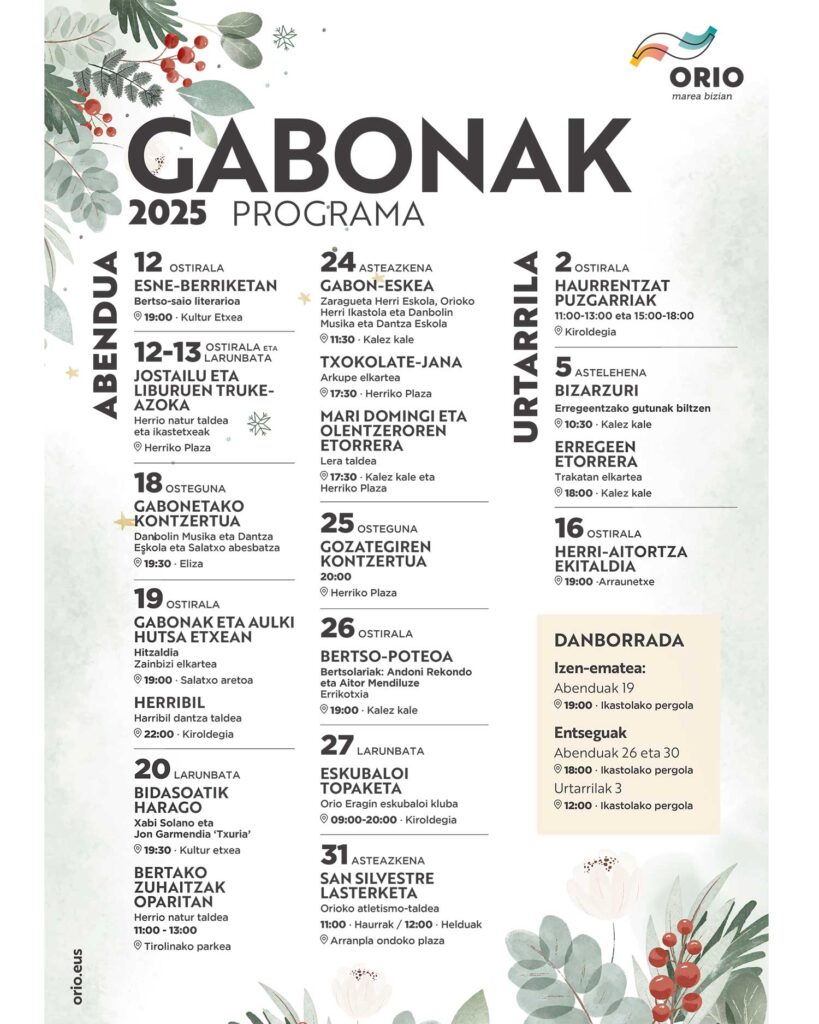 Abenduaren 26an, ostiralarekin, Herriko Plazatik hasita, bertso-poteoa egingo da kalez kale Andoni Rekondo eta Aitor Mendiluze bertsolariekin, eta urtea amaitzeko, San Silvestre lasterketa antolatuko du Orioko atletismo-taldeak hilaren 31n. Izen-ematea zabalik da jada.