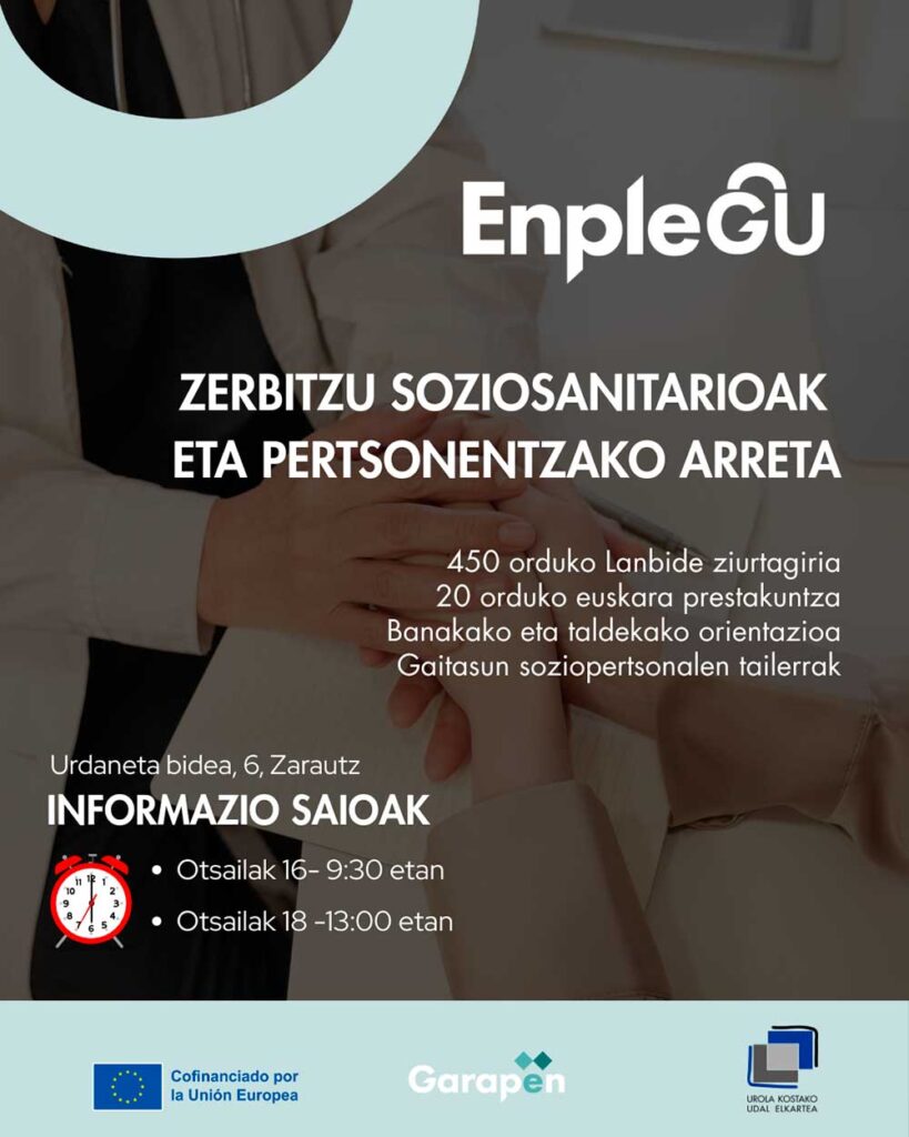 Urola Kosta Udal Elkarteak, Garapen Agentzien Euskal Elkartearen lankidetzarekin, EnpleGU egitasmoa jarriko du martxan. Ekimen honen bidez, langabezian dauden pertsonei edo laneratzeko prozesu batean daudenei funtsezko trebetasunak eta gaitasun profesionalak garatzen lagundu nahi zaie. Eta besteak beste, zaintzaren alorrean lan egin nahi duten herritarrentzako formakuntza eskainiko dute datozen hiletan.